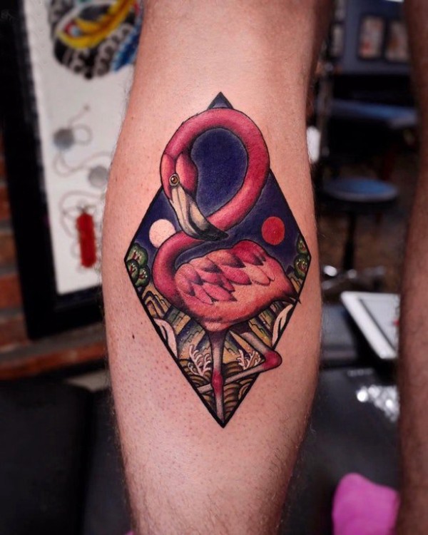 百乐动物纹身 男生小腿上菱形和火烈鸟纹身图片