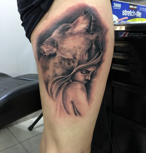 纹身大腿男 男生大腿上狼和人物肖像纹身图片