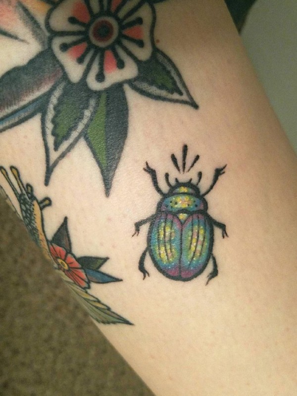 纹身动物 女生小腿上彩色的昆虫纹身图片