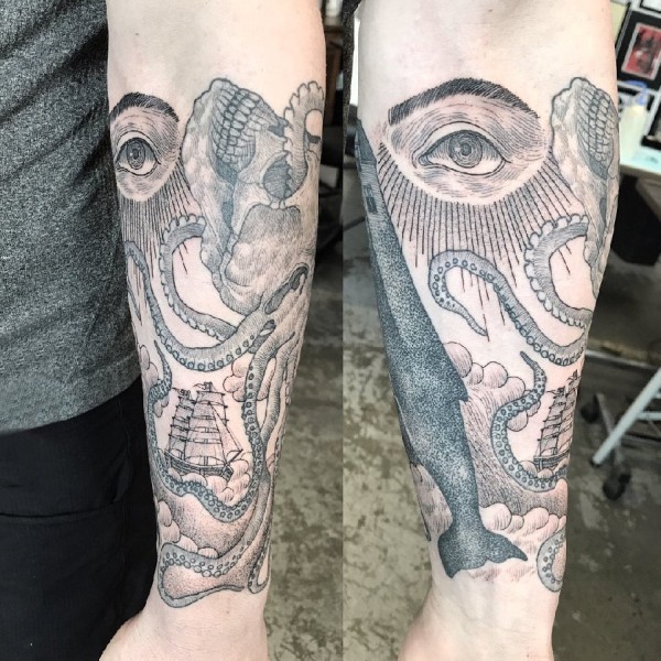 眼睛纹身 男生手臂上黑色章鱼纹身图片