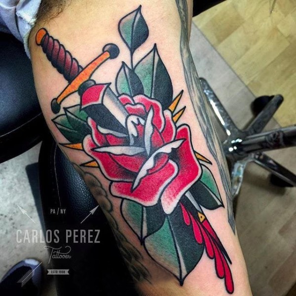 欧美玫瑰纹身 男生手臂上花朵纹身图片