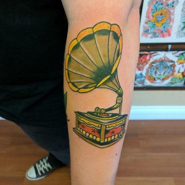 音乐纹身图案 男生手臂上留声机音乐纹身图案