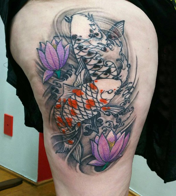 阴阳鲤鱼纹身 女生大腿上花朵和阴阳鲤鱼纹身图片