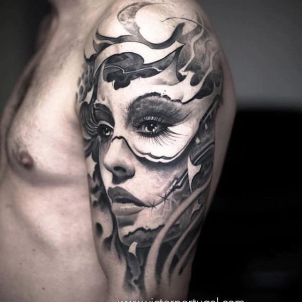 男人大臂黑白彼岸花骷髅_黑白纹身图案大全_纹身图吧