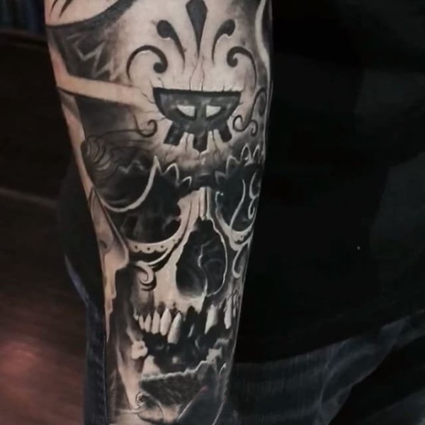 男人大臂黑白彼岸花骷髅_黑白纹身图案大全_纹身图吧
