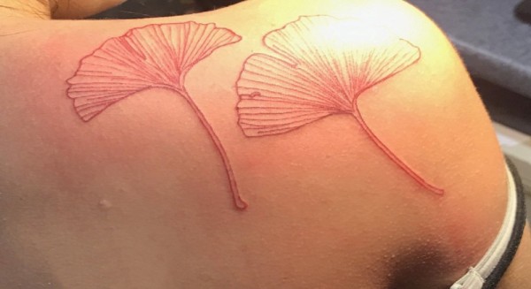 银杏叶纹身 女生肩部红色的银杏叶纹身图片