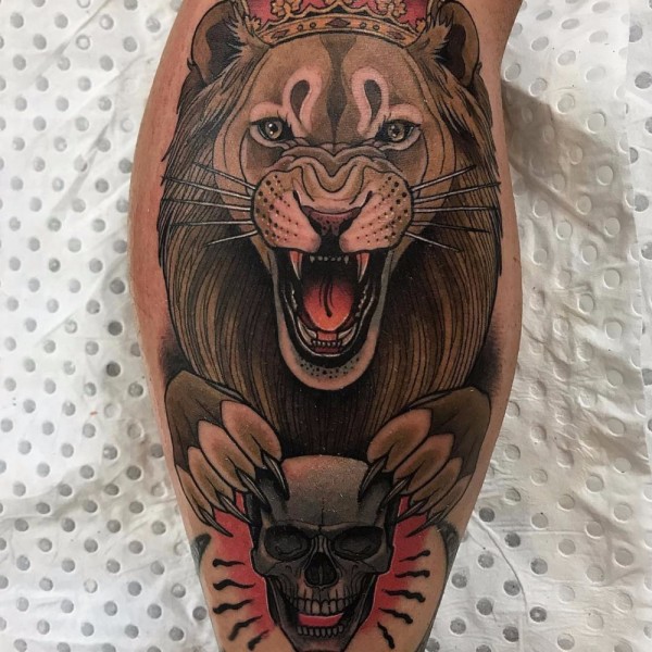 狮子王纹身 男生小腿上骷髅和狮子纹身图片