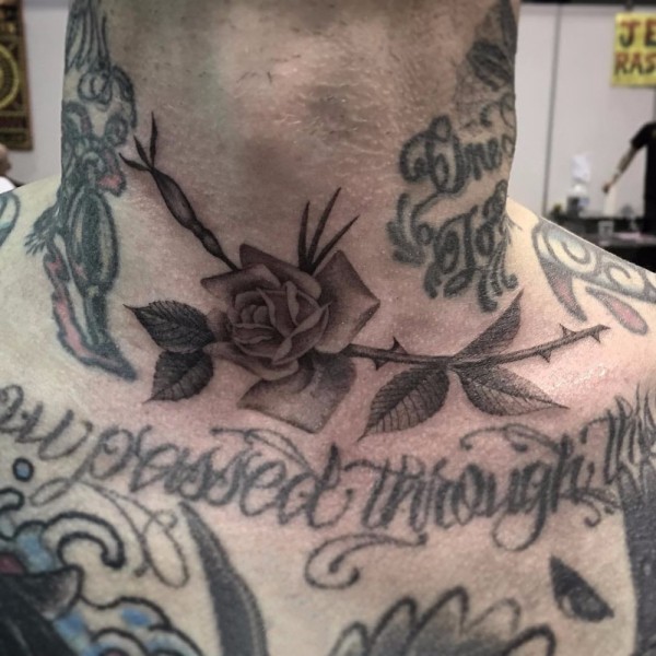 男颈部纹身 男生颈部黑灰的玫瑰纹身图片