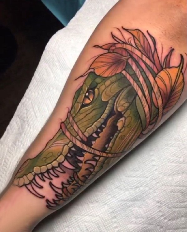 百乐动物纹身 男生手臂上树叶和鳄鱼纹身图片