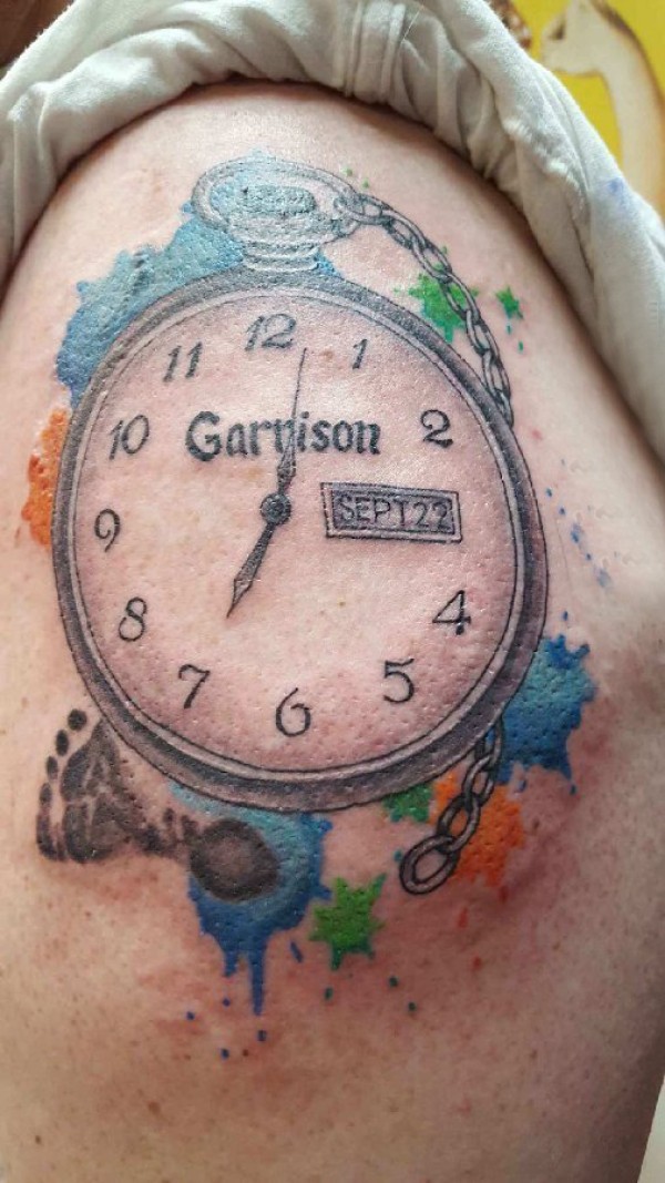 时钟纹身 男生大臂上彩色的时钟纹身图片
