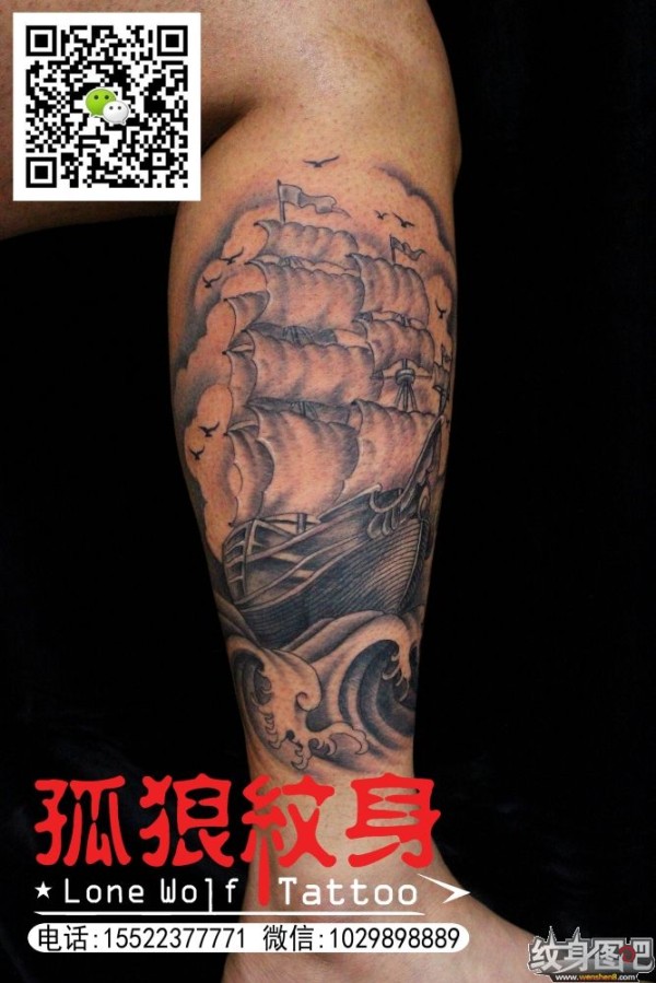 宝坻纹身 小腿帆船纹身 宝坻孤狼纹身工作室作品 天津