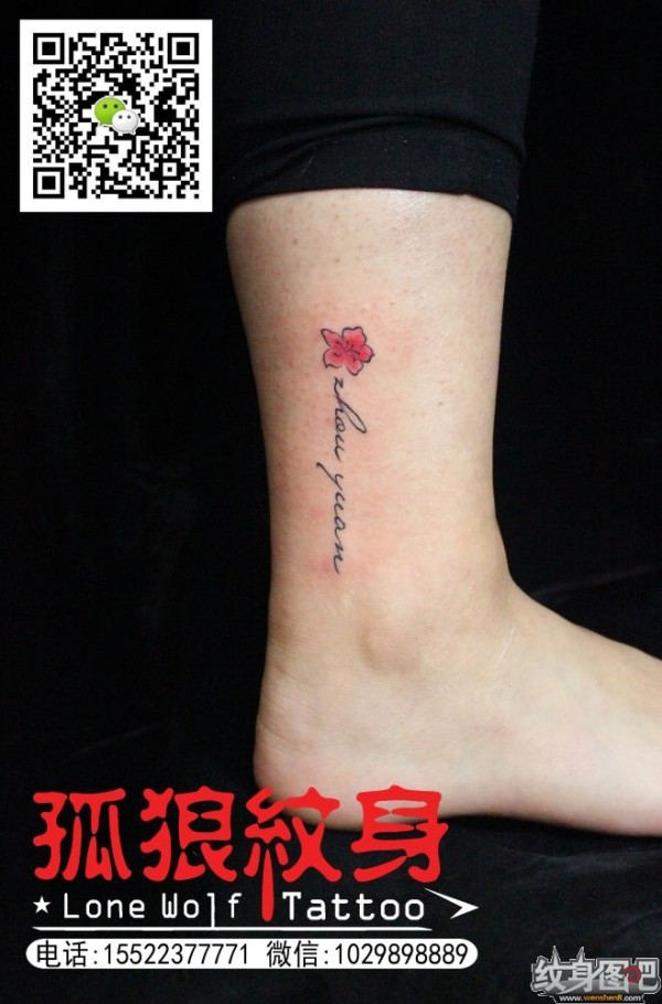 宝坻纹身 美女生感脚踝花英文小清新纹身 宝坻孤狼纹身工作室作品 天津