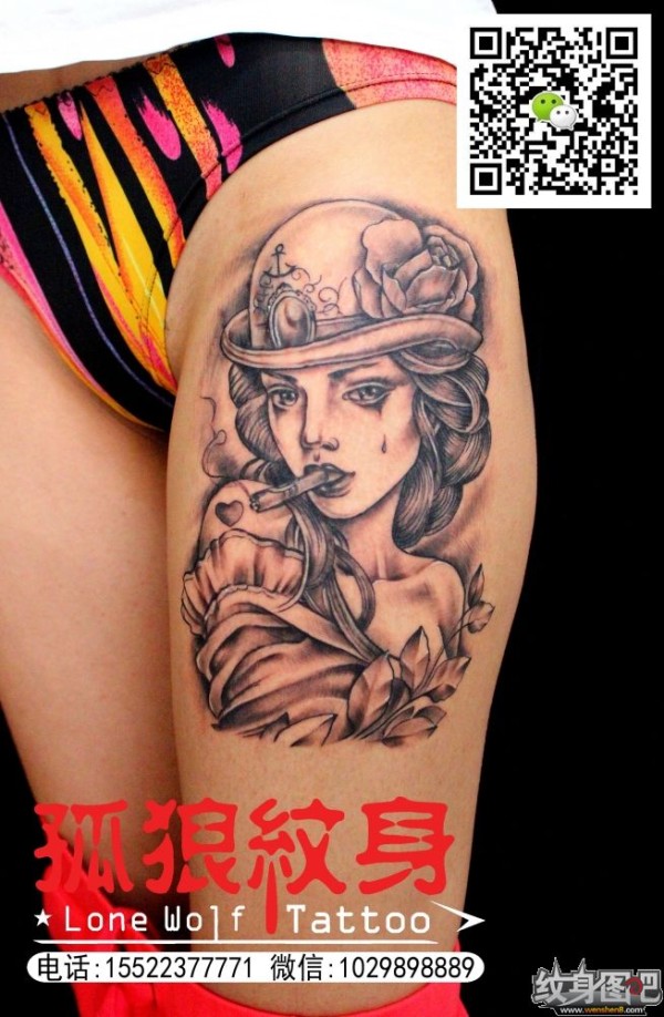 宝坻纹身 美女生感大腿欧美女性纹身 宝坻孤狼纹身工作室作品 天津纹身