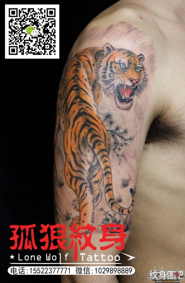 宝坻纹身 男人大臂彩色上山虎纹身 宝坻孤狼纹身工作室作品 天津纹身