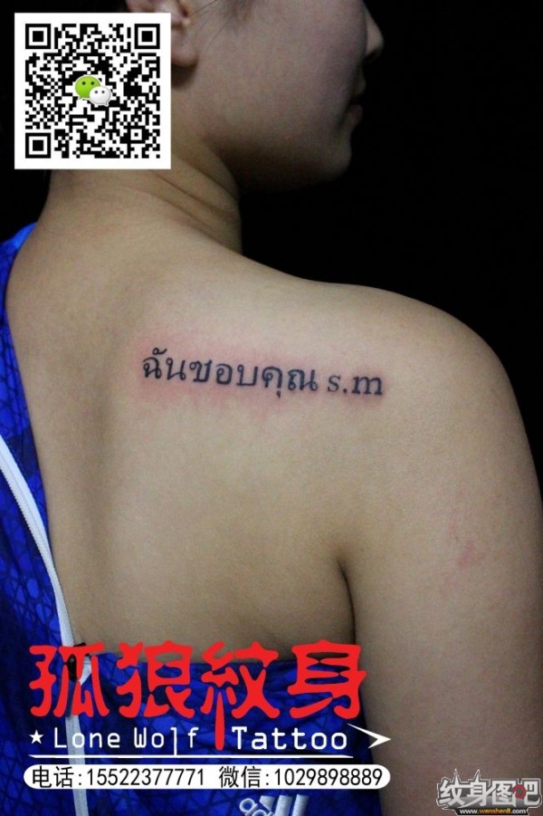 宝坻纹身 女性后肩胛泰文我爱你纹身 宝坻孤狼纹身工作室作品 天津纹身
