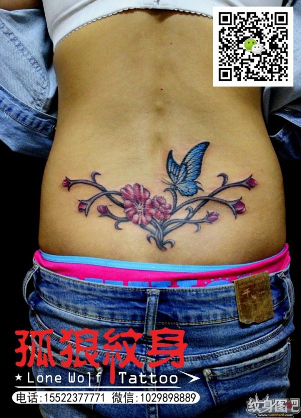 宝坻纹身 美女生感蝴蝶花腰花纹身 宝坻孤狼纹身工作室作品 天津纹身