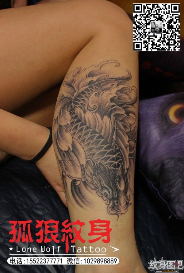 传统鲤鱼花小腿纹身_腿部纹身图案大全_纹身图吧