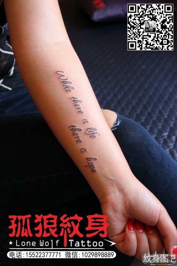 美女小臂英文纹身 宝坻孤狼纹身工作室作品 宝坻纹身 天津纹身 孤狼纹身 小臂纹身 英文纹身