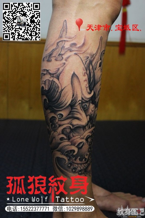 男士小腿般若纹身 宝坻孤狼纹身工作室作品 宝坻纹身 孤狼纹身 天津纹身 小腿纹身 般若纹身