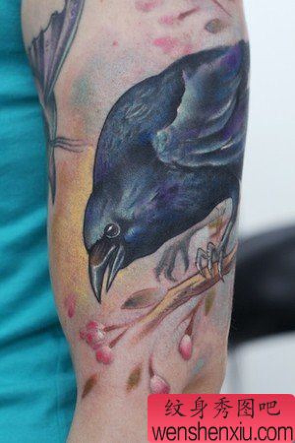 专业纹身图库分享一张很好的大臂乌鸦樱花纹身图案