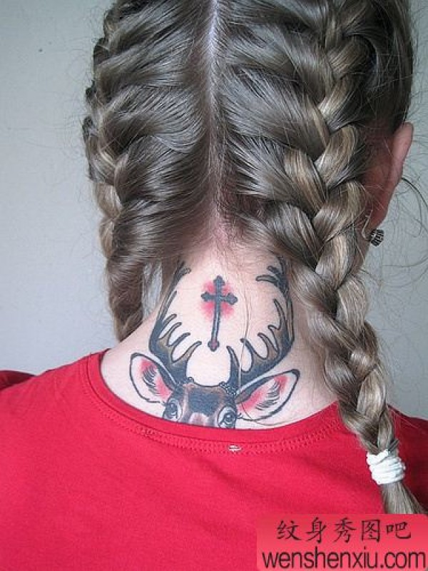 欧美超酷的一张后颈鹿纹身作品图片
