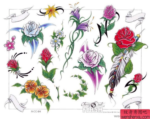 玫瑰花卉纹身图案:玫瑰羽毛纹身作品图片