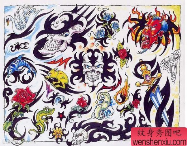 玫瑰海豚天鹅花卉骷髅图腾纹身图案