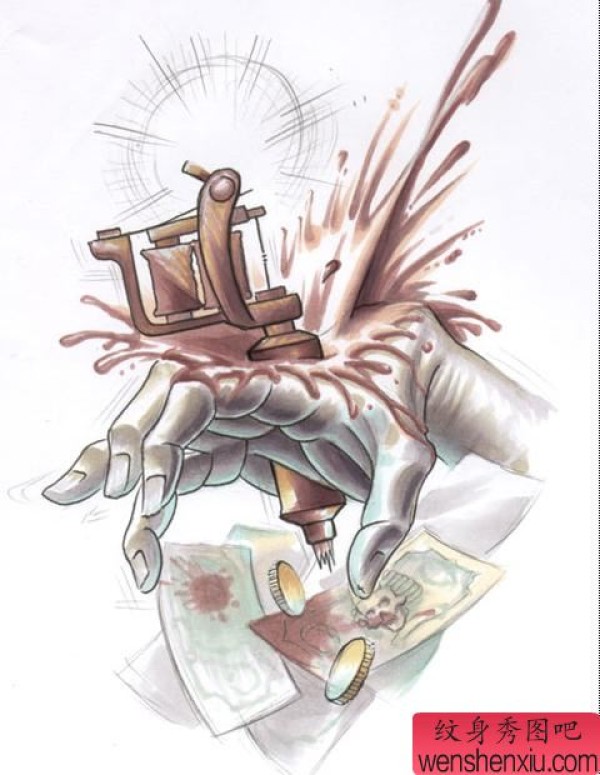惊险超酷的一张手稿手纹身机纹身作品图片