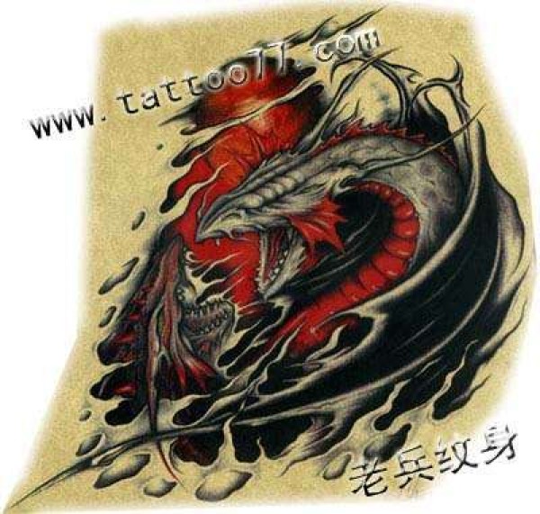 一张经典的欧美撕皮飞龙翼龙纹身作品图片