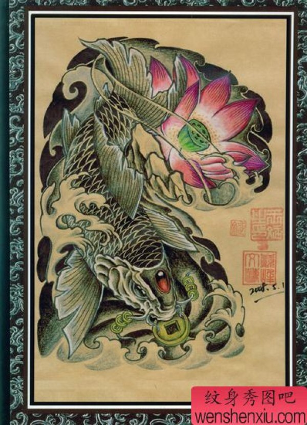 彩色鲤鱼莲花半胛纹身图案纹身图片