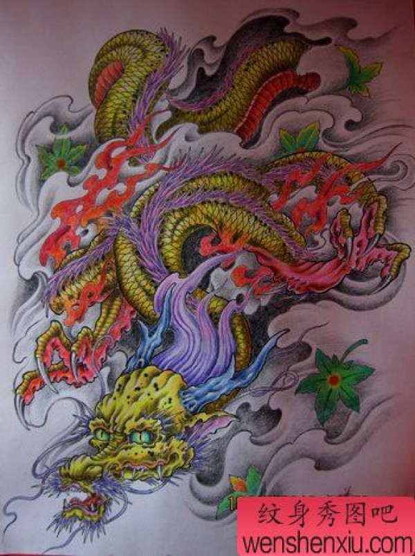 满背彩色火焰龙纹身图案纹身图片