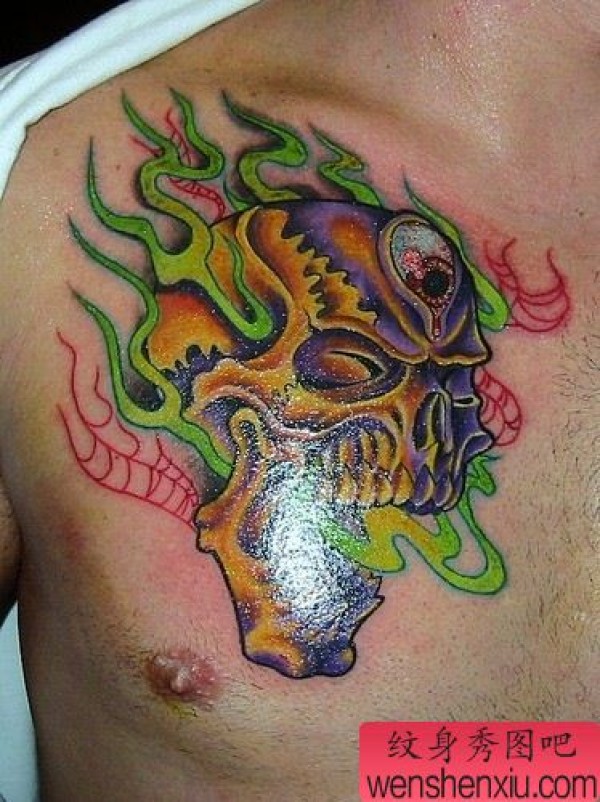 超酷的胸部彩色骷髅纹身作品图片(精品)