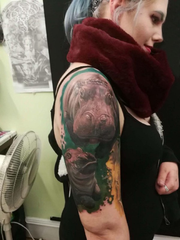 双大臂纹身 女生大臂上彩色的河马纹身图片