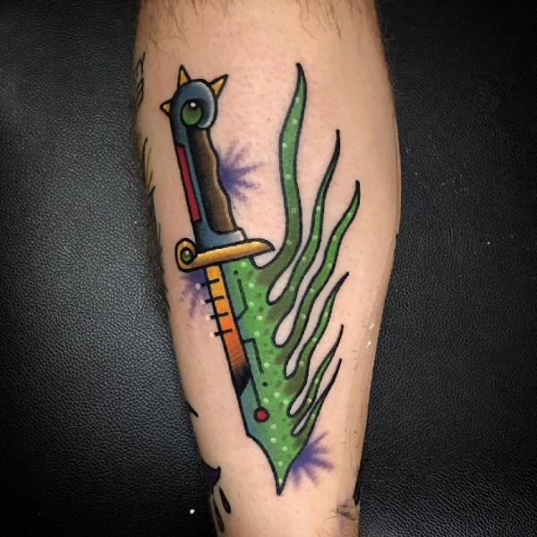 欧美小腿纹身 男生小腿上彩色的匕首纹身图片