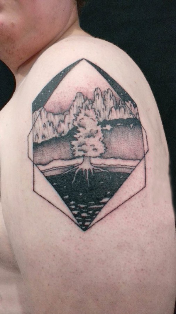 双大臂纹身 男生大臂上几何和大树纹身图片