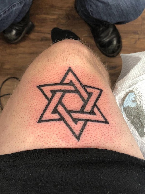 六芒星纹身图 男生大腿上黑色的六芒星纹身图片