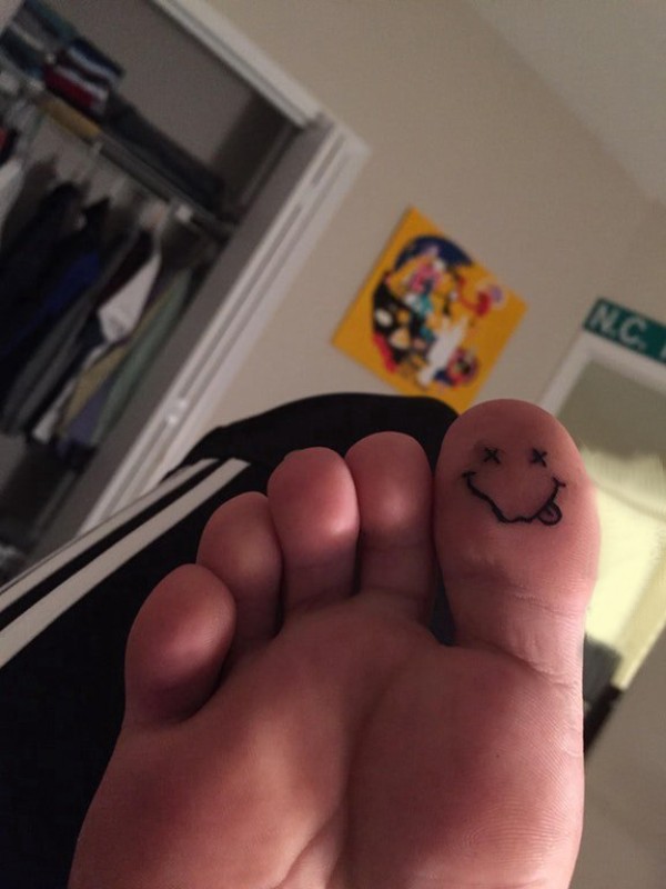 极简线条纹身 男生脚掌上黑色的表情纹身图片