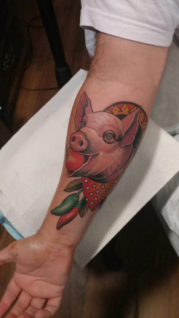 纹身猪 男生手臂上彩绘植物和猪纹身图片