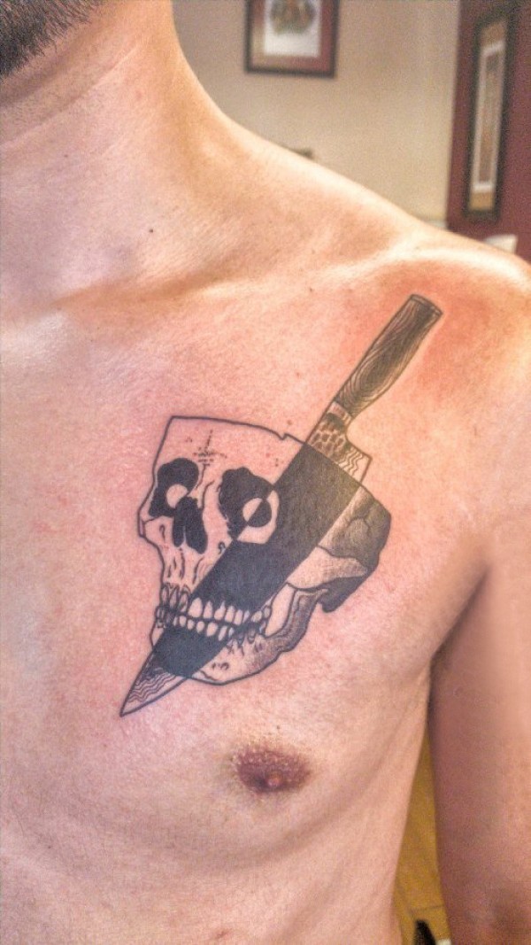 纹身胸部男 男生胸部匕首和骷髅纹身图片