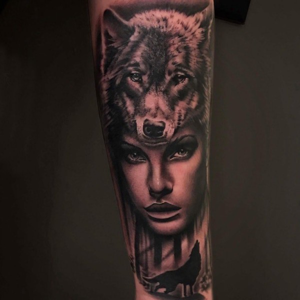手臂纹身素材 女生手臂上狼头和人物纹身图片
