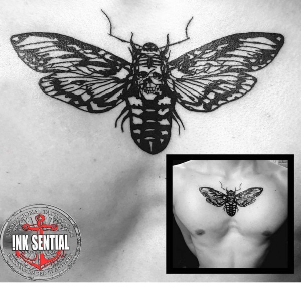 纹身胸部男 男生胸部骷髅和蝴蝶纹身图片