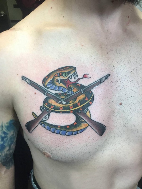 纹身胸部男 男生胸部彩色的枪和蛇纹身图片