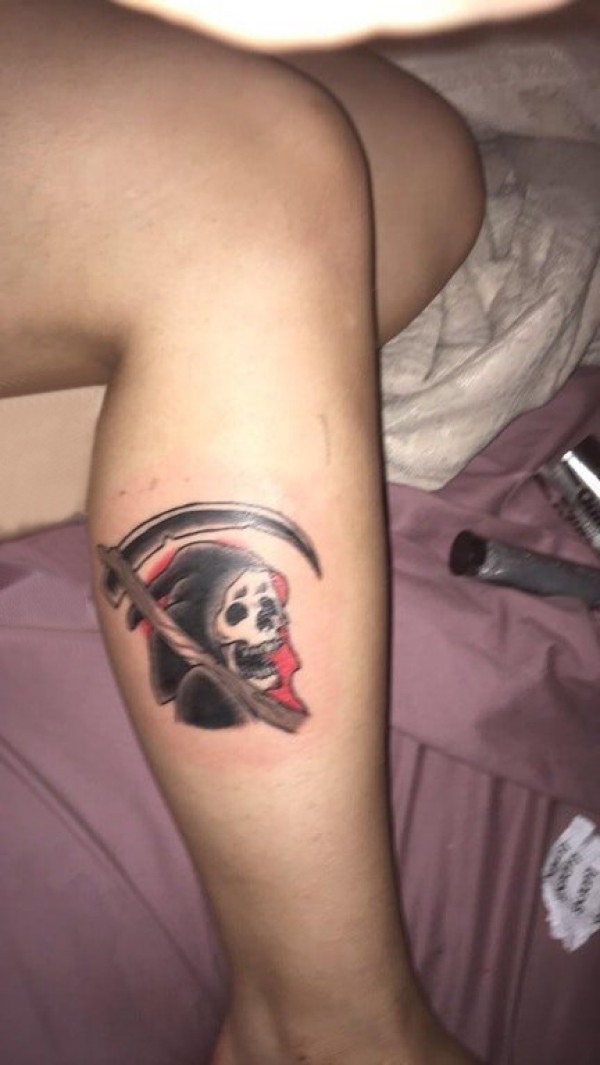 小腿对称纹身 女生小腿上彩色的死神镰刀纹身图片