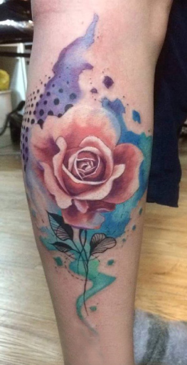 小腿对称纹身 女生小腿上彩色的玫瑰纹身图片