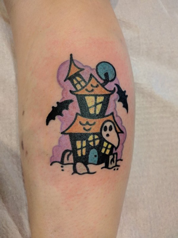 小腿对称纹身 女生小腿上彩色的建筑物纹身图片