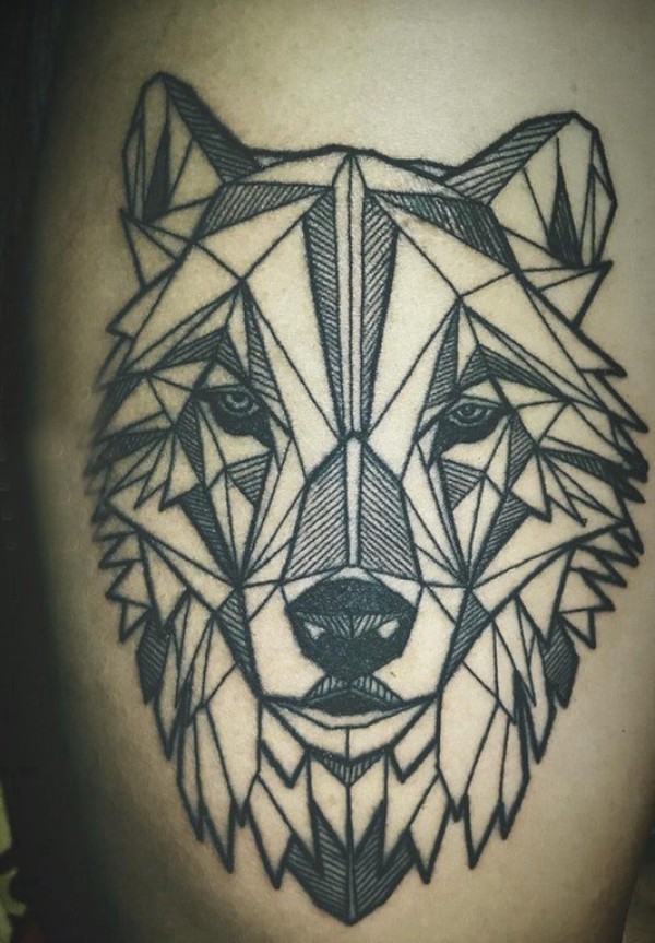 小腿对称纹身 男生小腿上黑色的几何狼头纹身图片