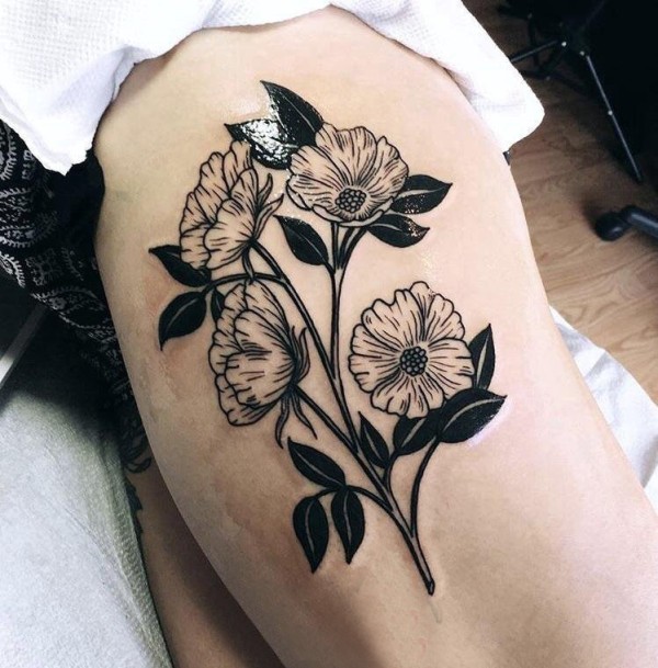 大腿传统纹身 女生大腿上黑色的花朵纹身图片