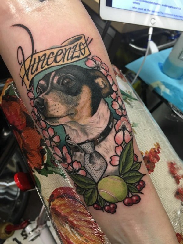 百乐动物纹身 女生手臂上植物和小狗纹身图片