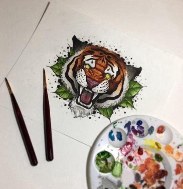 百乐动物纹身 彩色的叶子和老虎纹身手稿