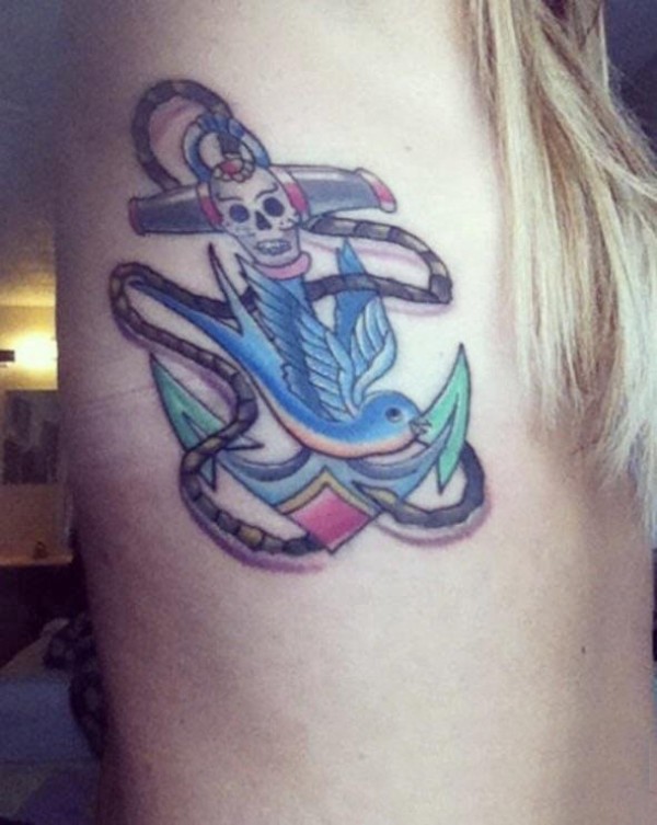 侧腰纹身图 女生侧腰上小鸟和船锚纹身图片